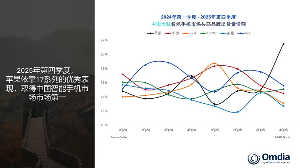 2025 年第四季度,成绩于年末促销及国补计谋的不时,大盘跌幅有所收窄,中国大陆智妙手机阛阓四季度同比下跌 1%,出货 7640 万台。苹果以 1650 万台的出货量得回第一,占据 22% 阛阓份额;vivo 排行第二,出货量 1195 万台,阛阓份额为 16%。