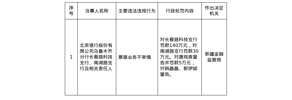 罚单表示,北京银行乌鲁木王人分行长春路科技支行、南湖路支行的主要犯罪违法举止:单据业务不审慎。