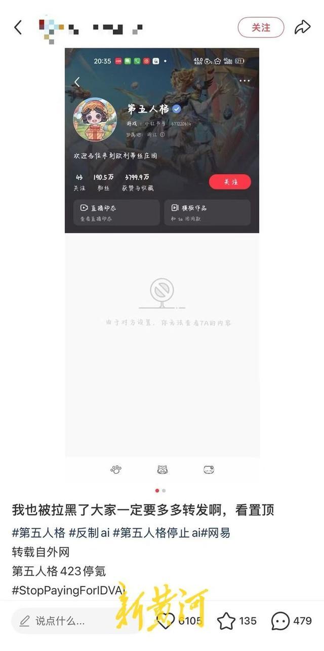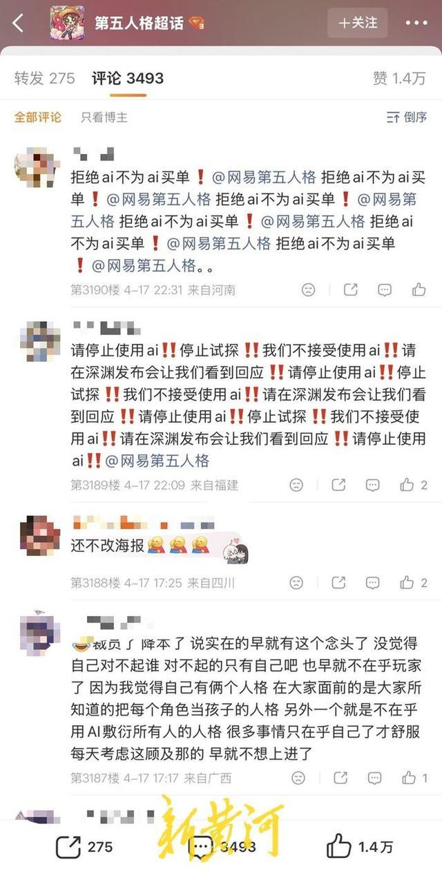 这次对于《第五东说念主格》的AI争议愈演愈烈,雄壮玩家则在酬酢平台通过多种神志进行阻抑。有东说念主更换头像、昵称来抒发发火,有东说念主到官方账号洽商区刷屏“罢手使用AI”“不为AI买单”等,以此发出抗议。有玩家明确表明如若官方链接使用AI,将罢手氪金复旧,致使玩家群体策动于4月23日发动集体抗议。然则,《第五东说念主格》迟迟莫得对此作出修起,却有玩家发现官方账号偷偷拉黑用户、删除洽商或改图。