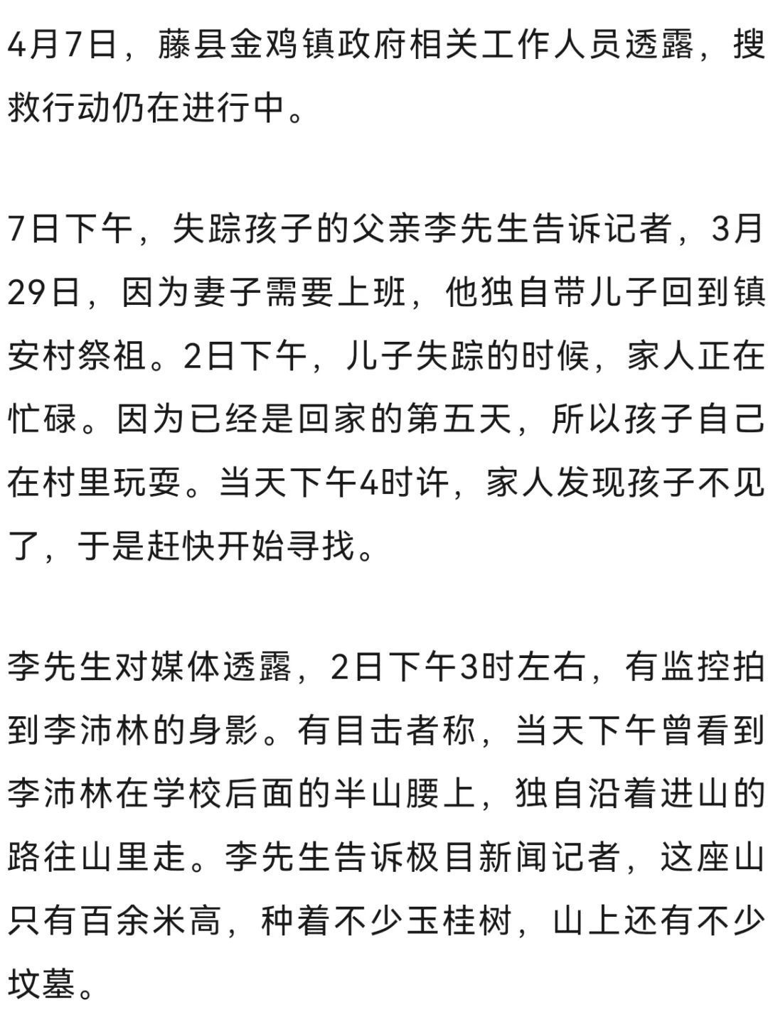 藤县金鸡镇东谈主民政府此前通报欧洲杯体育,4月2日欧洲杯体育,该镇接报镇安村龙井组又名8岁儿童(男,患有自闭症,讲话疏导才气弱)随父返乡祭祖,于当日15时许在镇安村小学龙井分校隔邻走失。经家属搜寻无果后报警。8日上昼,孩子的父亲李先生接听极目新闻记者电话时止境昌盛,关于找到孩子他止境欢笑。他先容说,孩子是今天上昼在一座山脚的小河水边找到的,这座山距家约1公里,并非孩子走失机的那座山。他说,找到的技艺孩子的景色还可以,现在还是送到病院进行查验。孩子这几天是怎样过来的?吃饭在那处?住在那处?关于这些问题,李先生暗意还莫得与孩子好好疏导,现在尚不知情。此前报谈4月6日,梧州市藤县金鸡镇东谈主民政府发布情况通报称,4月2日,镇安村龙井组又名8岁儿童李沛林(男,患有自闭症,讲话疏导才气弱)随父返乡祭祖,于当日15时许在镇安村小学龙井分校隔邻走失。走失机身着蓝白灰毛衣、诟谇条纹裤、塑料拖鞋。接报后,镇公安民警、镇村干部、怜惜宇宙立即开展搜寻使命,梧州市、藤县公安部门也连忙转移精干力量,并调配警犬、热成像无东谈主机等专科成立队列扩大搜寻范围。摈弃4月6日21时,暂未发现痕迹,搜寻使命仍在进行。
