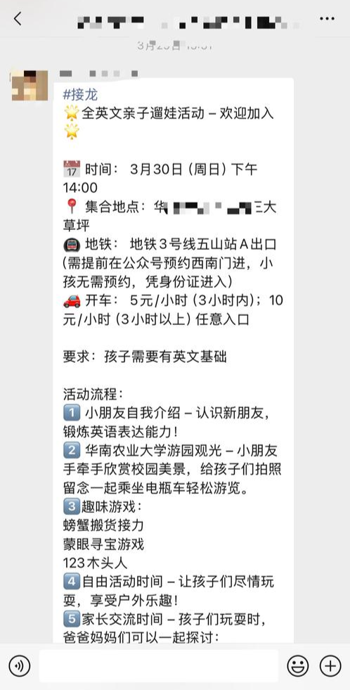 “坐标广州,找有一定英文基础的小一又友家庭周末一谈遛娃,让娃娃们全英文换取。”