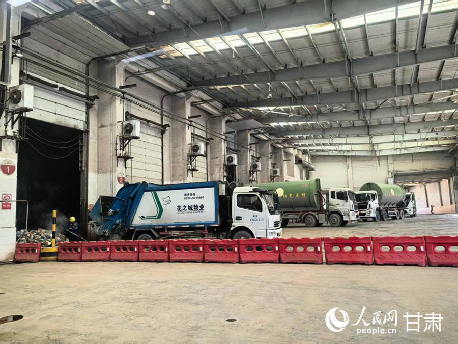 在临夏鹭鸿环保电力有限公司,垃圾运载车进行卸料功课。东说念主民网记者 周婉婷摄