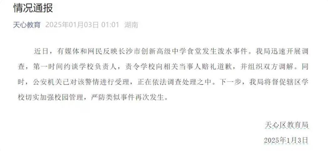 记者了解到,本年1月初,立异高档中学曾和为该校提供食堂和超市做事的公司产生经济纠纷,校方使命主说念主员向来讨帐老东说念主的被窝里泼水。而后天心区锻练局曾发布通报称,该局飞快开展访谒,第一时辰约谈学校崇拜东说念主,责令学校向相关当事东说念主赔礼说念歉开云体育(中国)官方网站,并组织两边并吞。