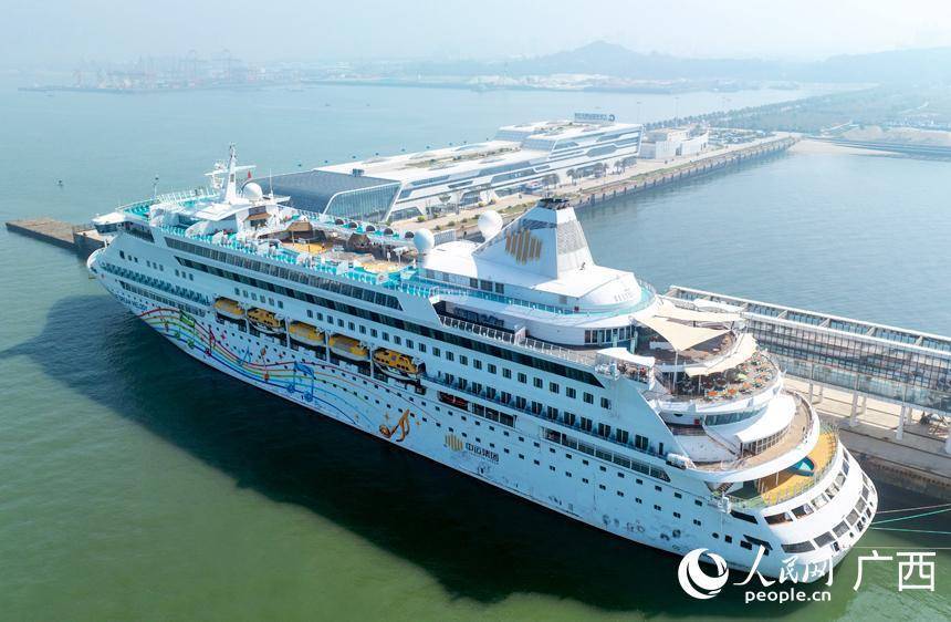 “蓝梦之歌”号外洋邮轮渐渐靠泊北海港邮汽船埠。